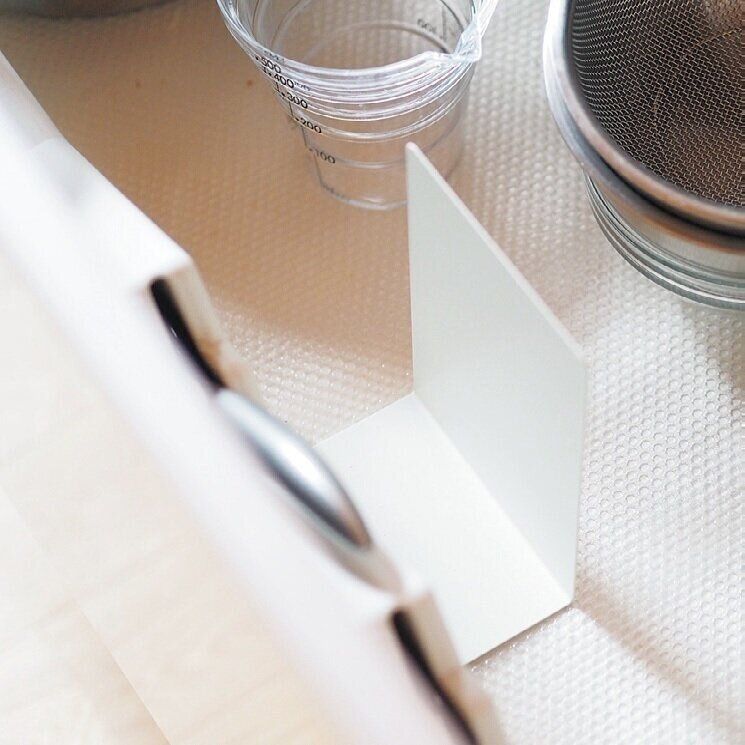 キッチンにある仕切りのない引き出しは、開け閉めのたびにツールや調味料が動いてイライラ。100円のブックスタンドで中の物を固定したら、悩みが解消!