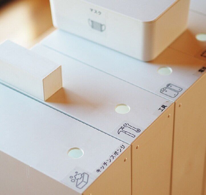 文字ラベルを貼っているのに、家族が収納場所を探していると気づいたyumihoさん。「小さい文字は読みにくいし、一瞬じゃ理解できない。100円のイラストラベルを採用したら家族の出しっ放しがなくなりました」。