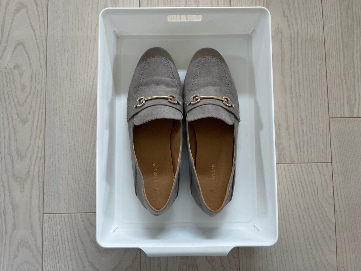 約幅23.8×奥行34×高さ7.3cmというサイズで、靴を1足分ぴったり収納できます。靴箱スペースをスッキリみせたいかたにおすすめ。男性の靴でもすっぽりと納まりますよ。