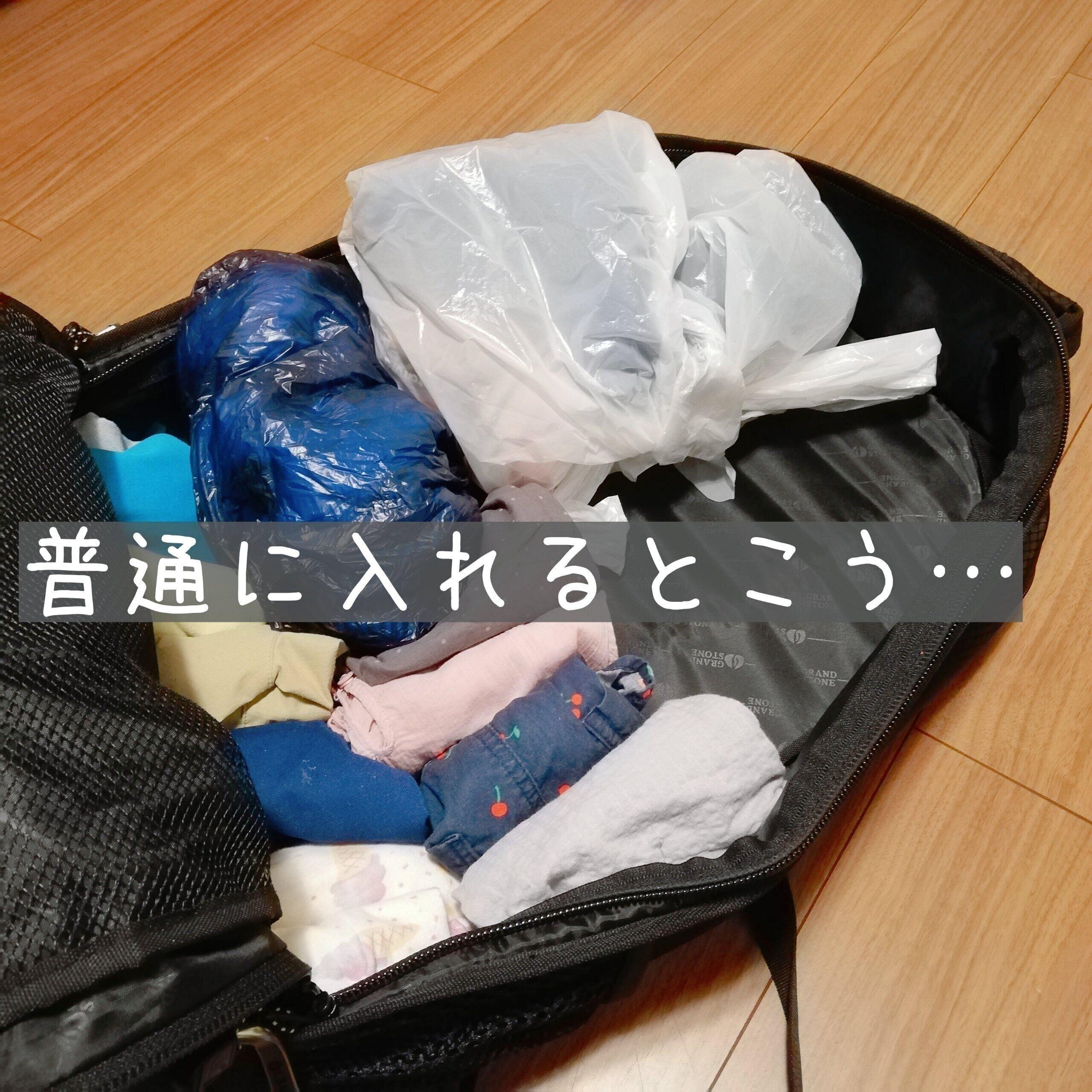 泊まりの荷物を最低限にしたとしても、家族分となればそれなりにかさばりますよね。なるべく身軽に移動したい私が、取り入れてよかった物が「圧縮バッグ」です。その効果は、衣類スペースが約50%も節約できるので驚きです。