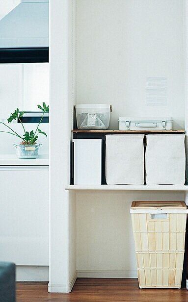 造り付け収納の棚板は、ラクに出し入れできる高さに2枚だけ設置。手を伸ばしたりしゃがんだりといったツラい体勢を取らなくていい、「疲れない収納」を実践しています。
