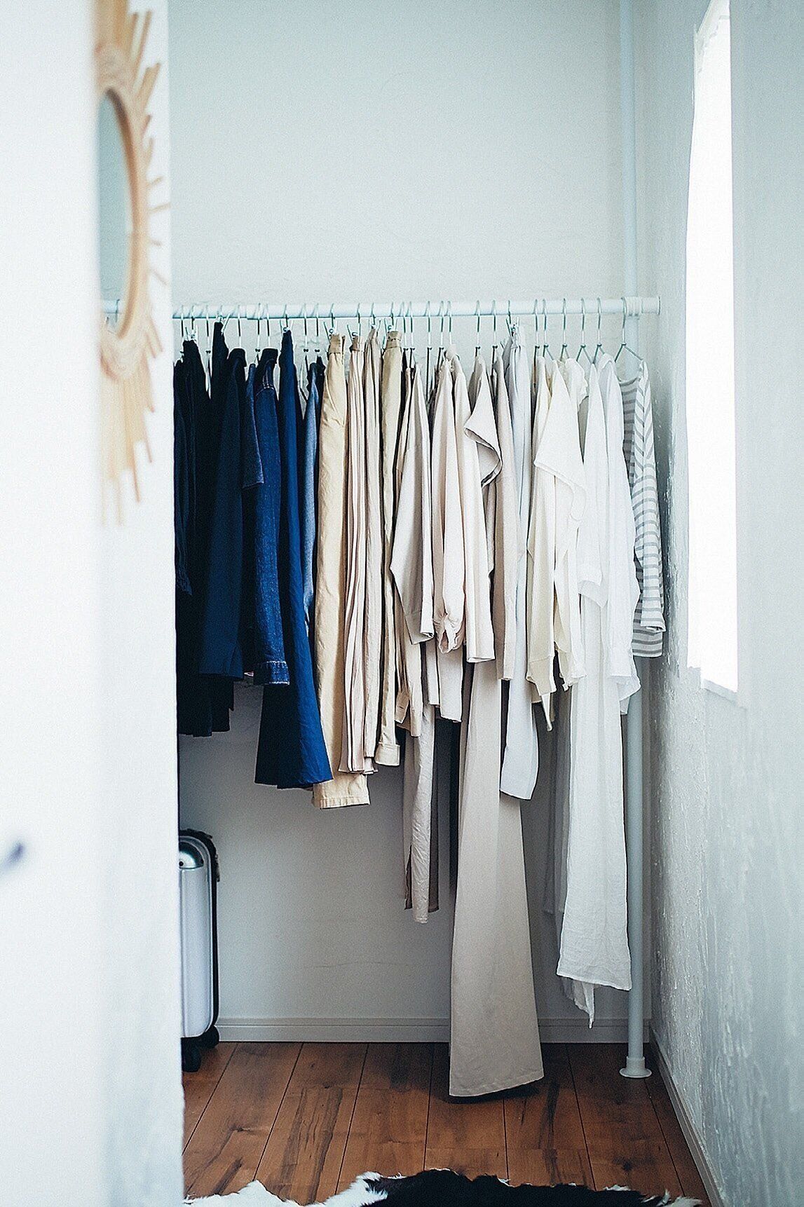 外出着はもちろん部屋着もインナーもつっぱり棒に「つるす収納」にして、たたむ手間をカット!床に衣装ケースを置く必要がなくなり、つらかった「かがむ体勢」からも解放されました。