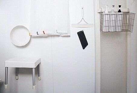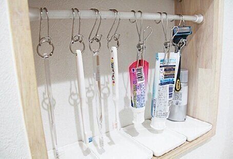 ぬめりやカビの原因になる水まわりの物は、すべてつるして収納。浴室はいすも洗面器もマグネットやフックを使って壁面にペタリ。歯ブラシは持ち手の穴にリングをつけて、S字フックでつるしています。