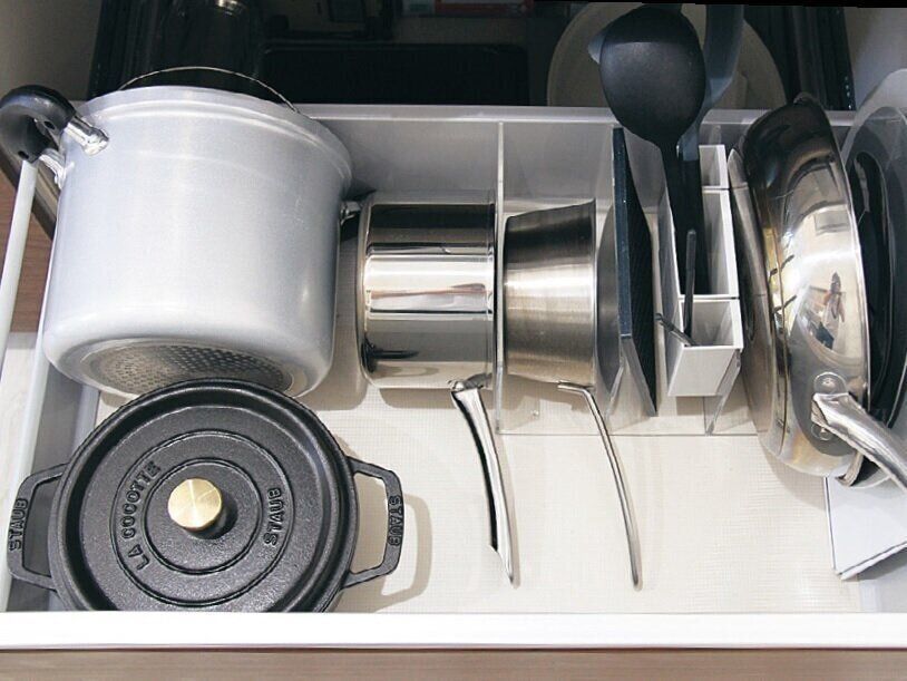 すぐ取れるからと、以前はつるしておいたキッチンツールは、一緒に使うフライパンや鍋とセットで引き出しに入れておくことで、「スッキリ」と「使いやすさ」を両立。