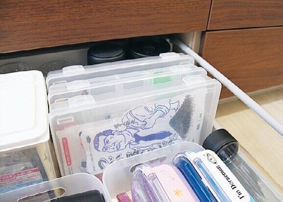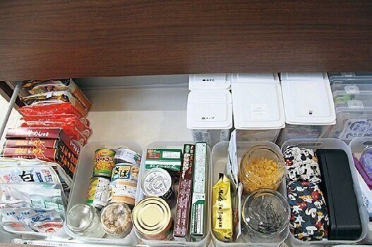 使いかけの袋入り食材は、種類別に100円の容器に入れて引き出しに入れればスッキリ片づきます。半透明なので何が入っているかわかりやすく、いちいち輪ゴムで縛る手間からも解放。