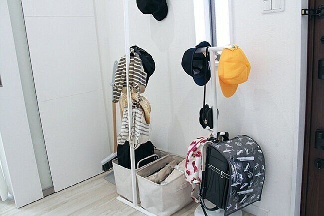 リビングのスッキリを維持するために、玄関にハンガーラックを置いて身支度コーナーに。外出に必要な物は全部ここにまとめておくようにしたら、リビングへの侵入がなくなりました。