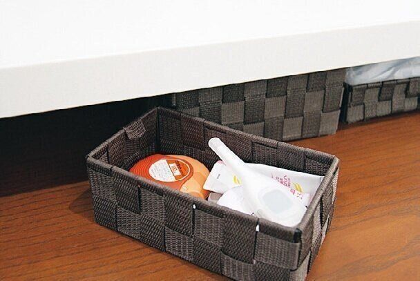 毎日使う薬や体温計、ウエットティッシュなどは、テーブルに置いておいたほうがすぐしまえて便利。同色系のかごに入れてテーブルとカウンターのすき間に並べています。