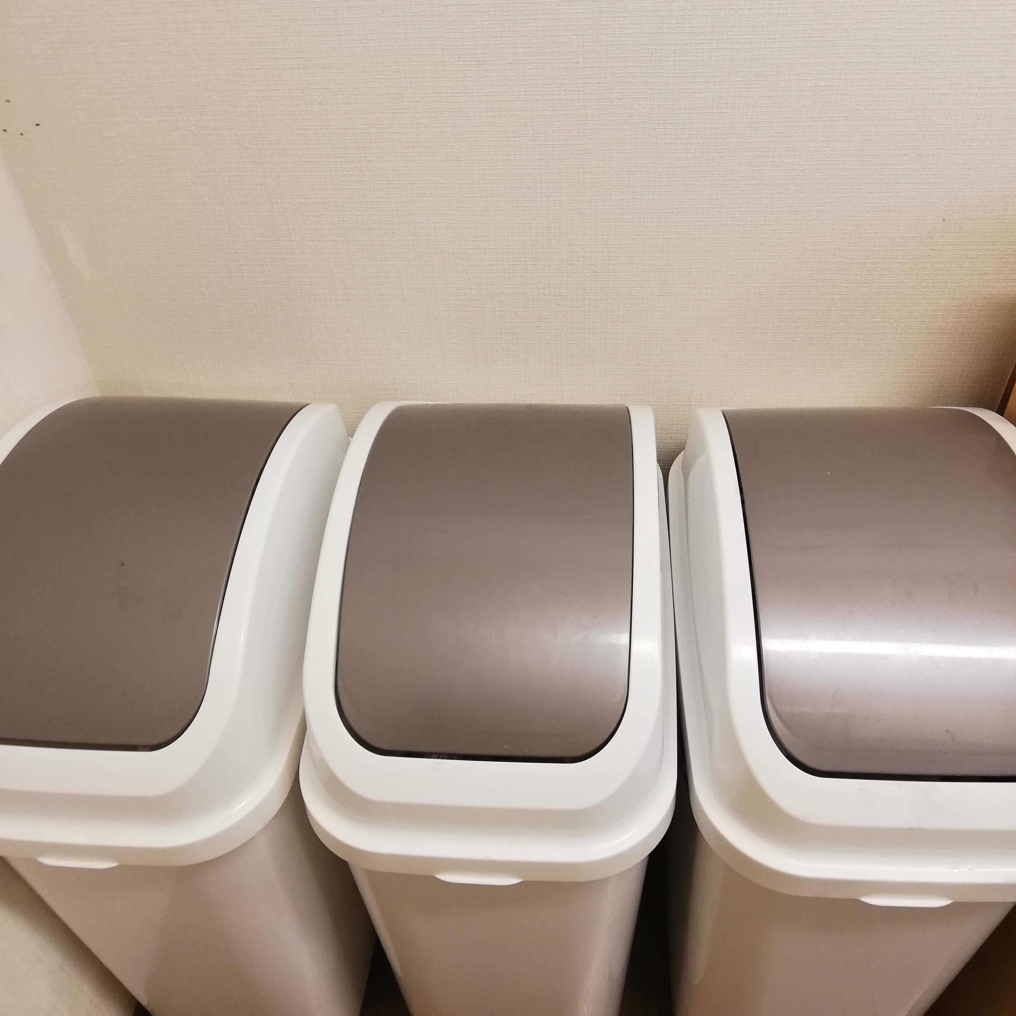 以前は、小さいゴミ袋を部屋に置いて、ベランダの大きなゴミ箱に都度捨てに行くスタイルでしたが、捨てに行く手間と大小ダブルで必要となるビニール袋の消費に疑問を感じ、分別ごとに各1つずつ大きなゴミ箱をキッチンに置くようにしました。