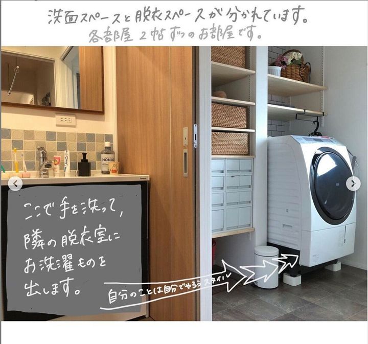 手洗い+片づけがセットで出来る隣り合わせの洗面所と脱衣所