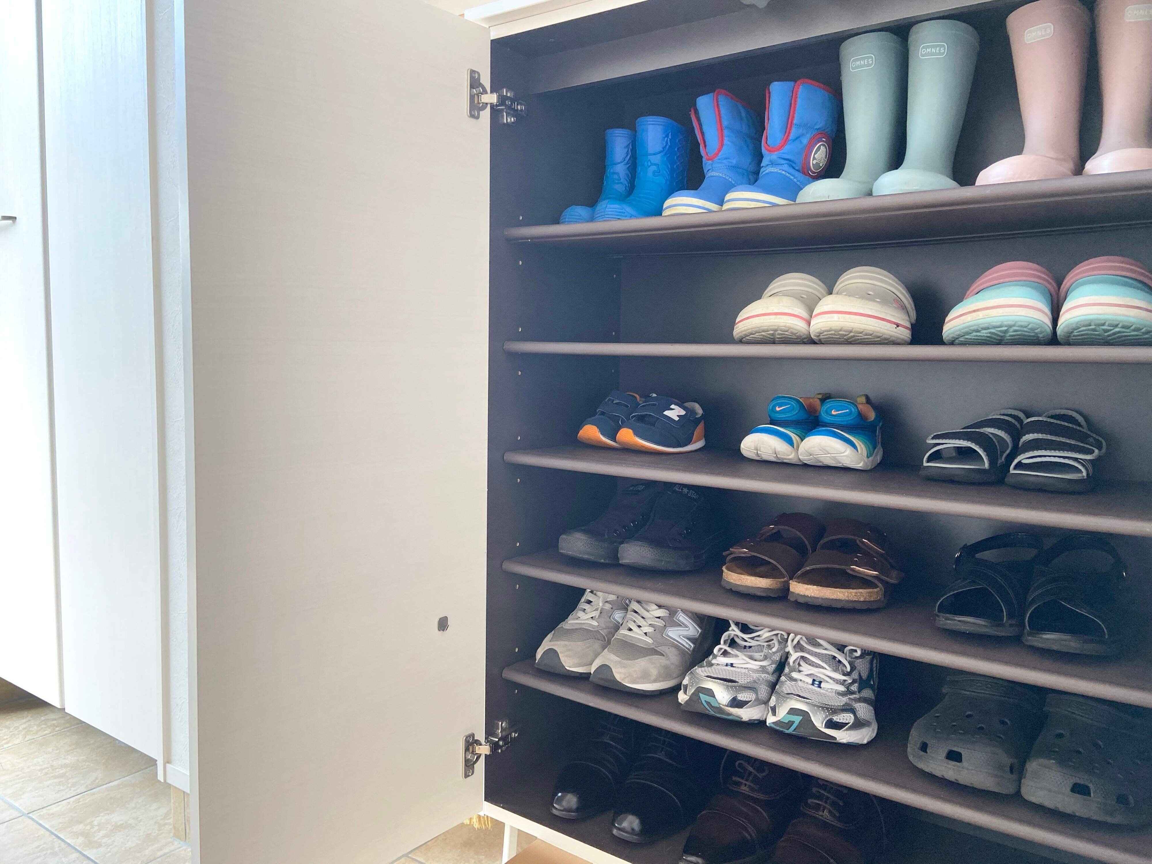 下駄箱に余裕がなくなると、すぐに溢れたモノたちが玄関を覆い尽くし始めます!玄関の靴は1人3〜6足までの定数管理にしています。1つINしたら1つOUTさせて定数をキープさせることで玄関の綺麗を保っています。