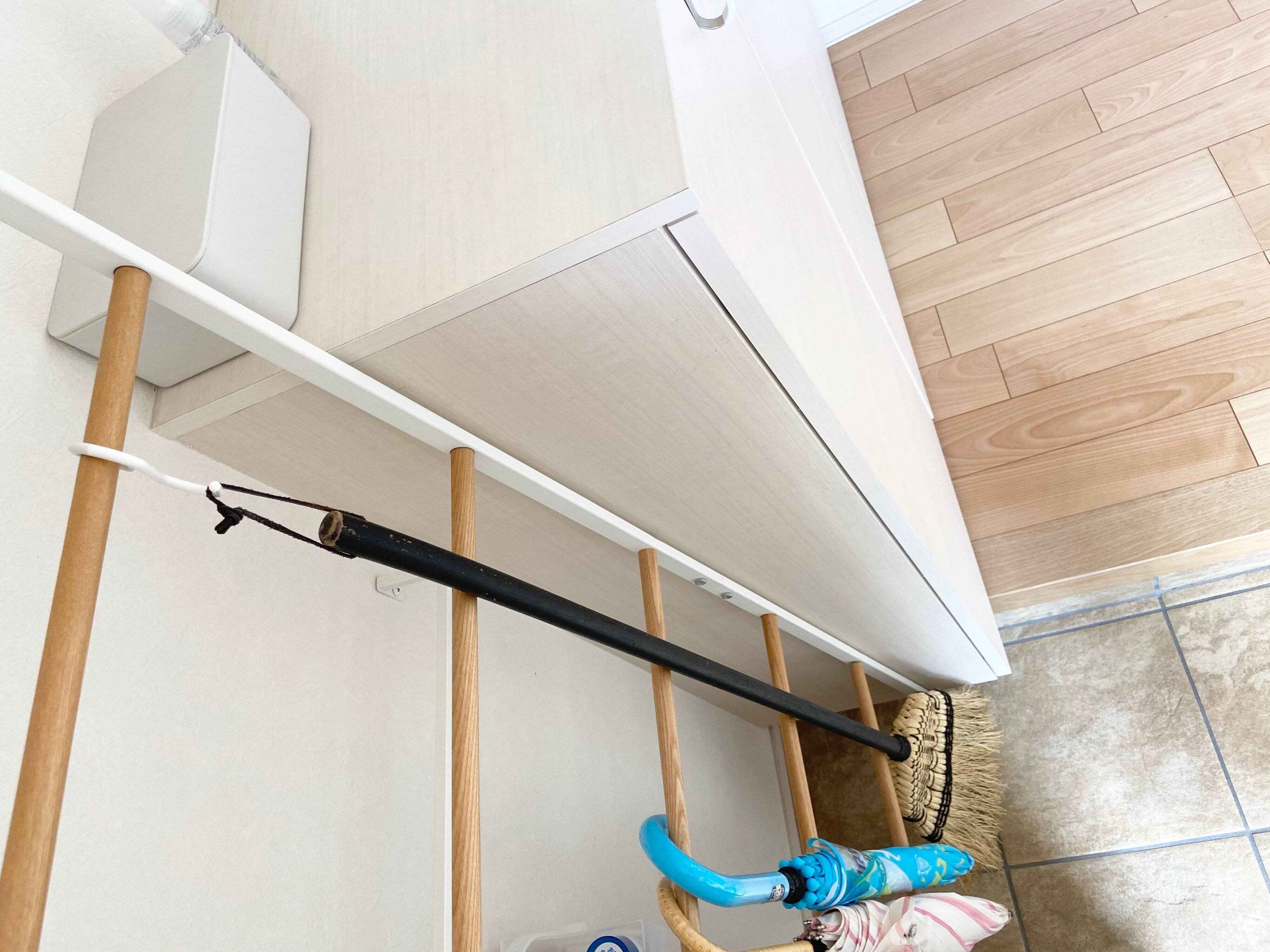 掃除は毎日ではなく、ゴミや砂、枯れ葉などが気になった時にしかしません。でも、気になった時にすぐに掃除ができるようにホウキは玄関ラダーに引っ掛けて、出しっぱなしの収納に!会社への出勤時、家族が出かけて玄関にちょうど靴が何もなくなったタイミングで砂埃を外に掃き出すようにしています。