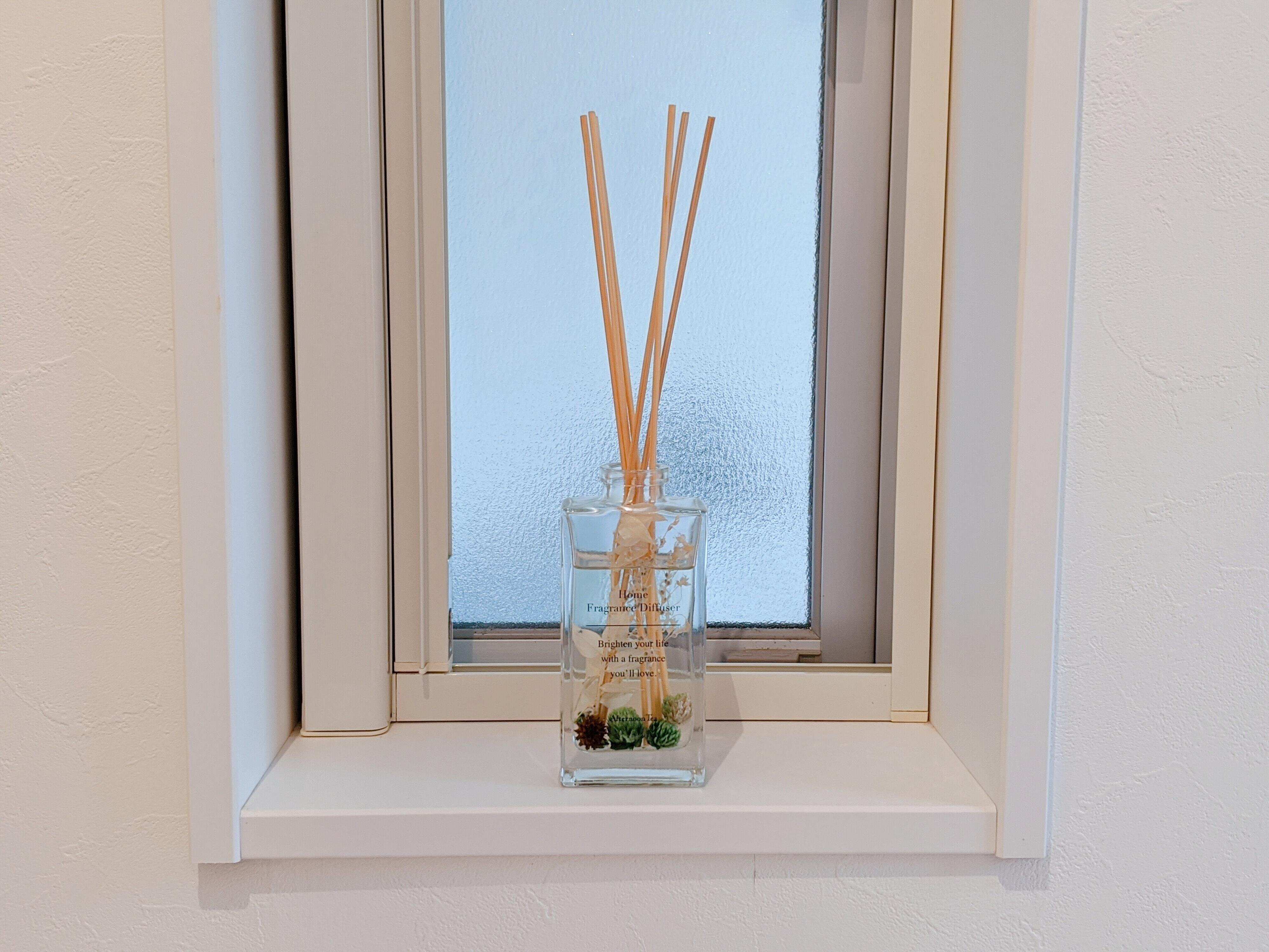 小窓の冊子には、北側の玄関なので匂い対策としてディフューザーのみ置いています。