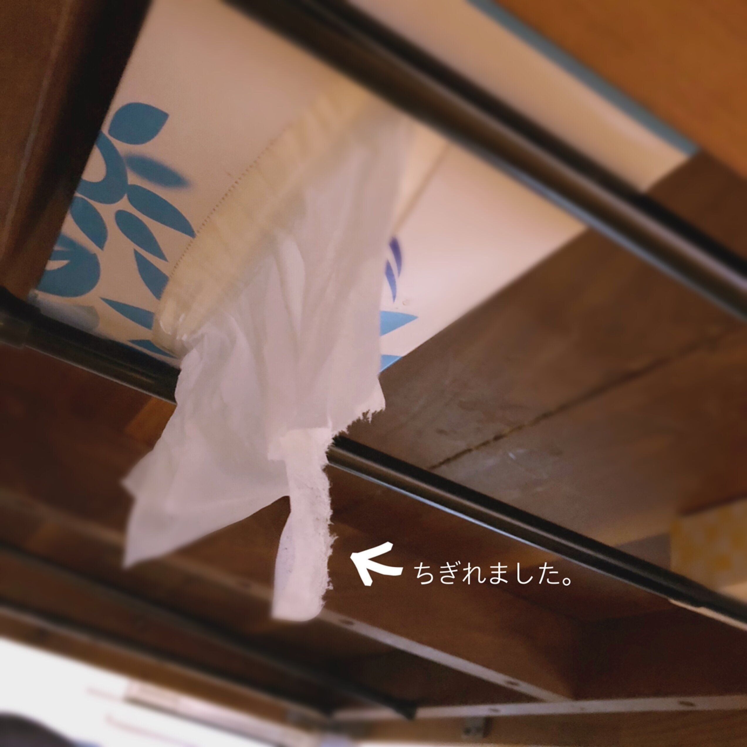 そして私の失敗「突っ張り棒収納」。テーブルの下に取りつけてティッシュケースをセット!おお、なんて便利!これは絶対神収納!と思いました。しかし、いざ使ってみると…、ティッシュが…ちぎれる…なんてことも「。ということで、我が家ではNG収納に。