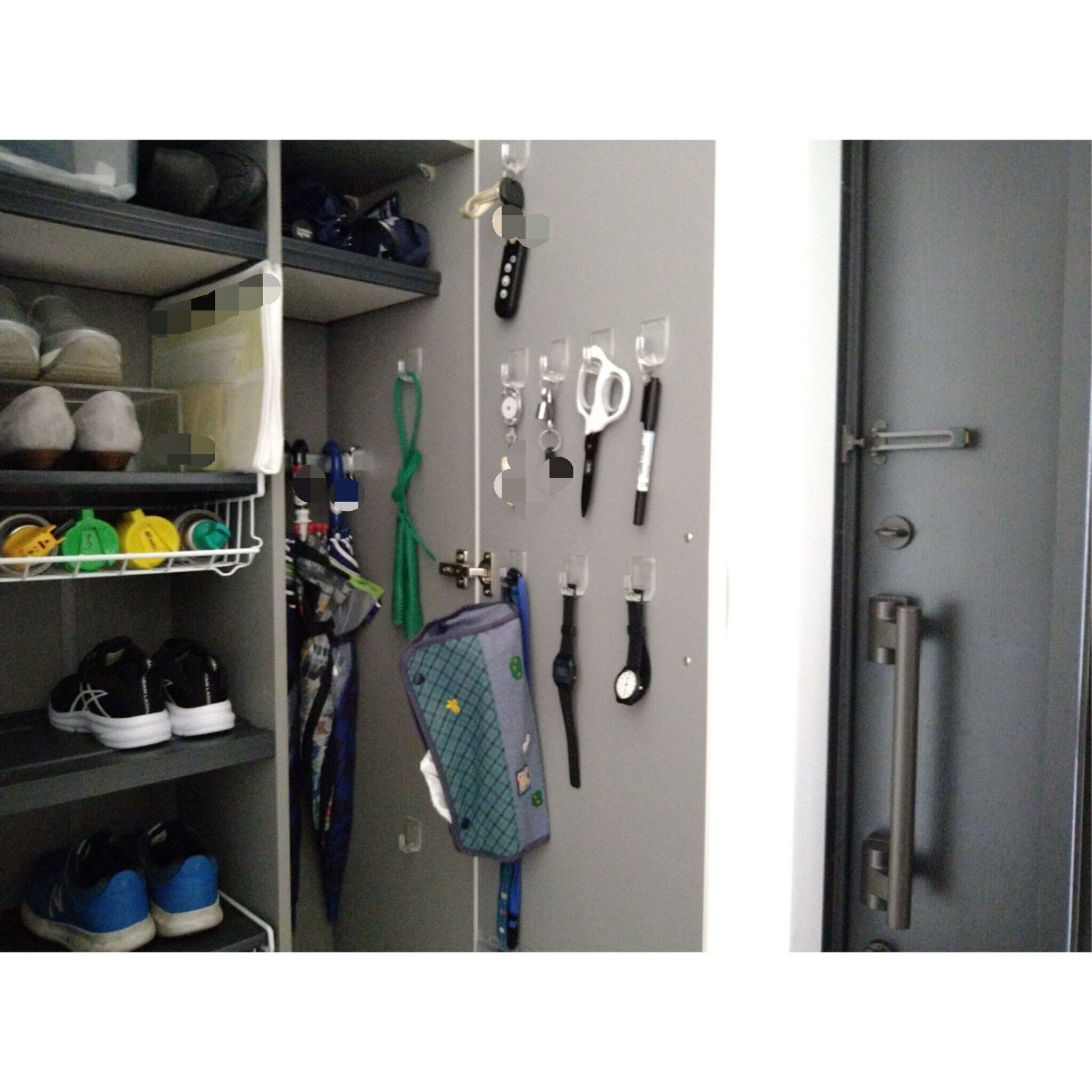 限られた玄関スペースなので扉裏や壁面を活用して「玄関にあると便利」なものを収納しています。このアイデアが皆さんの参考になれば嬉しいです。