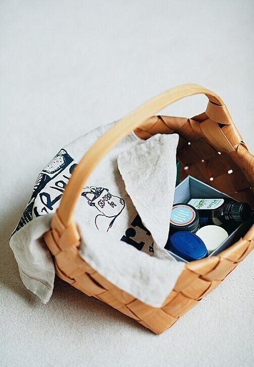 塗り薬やハンドクリームは、すぐに使えるようにダイニングのそばにおいておきたいけど、ごちゃつくので、さりげなく布で隠してます。