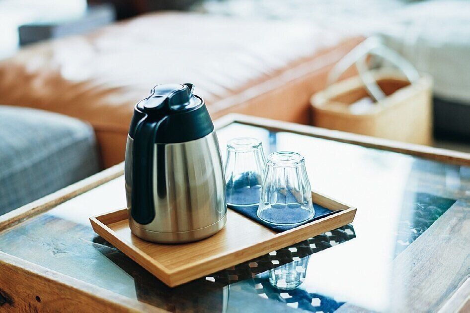 飲み物をせがまれるという小さな手間を解消するため、トレーにポットとグラスをセット。6歳の二女も、好きな場所に持ち運んで飲むように。