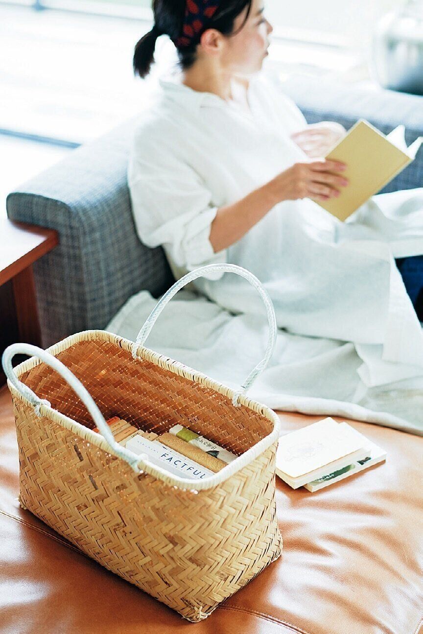 何冊もの本を並行して読む堺さん。読みかけの本をその辺に置きがちだったので、市場かごにまとめることに。読みたい本をセットして、ベッド、ソファ、べランダとその日の気分に合わせて好きな場所で読書を楽しんでいます。