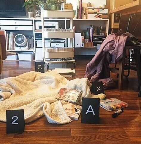 黒の厚紙で作った鑑識標識板を散らかってる部屋に置くと……「うわー、事件現場だ!」と子どもたちが笑いながら片づけてくれます。頻繁に使うと効果が薄れるのが玉にきず(笑)。