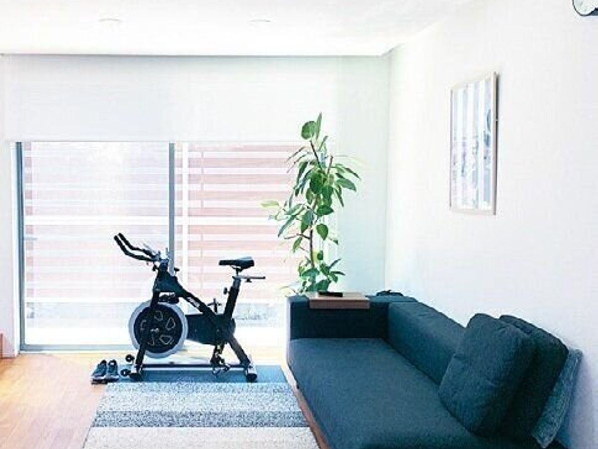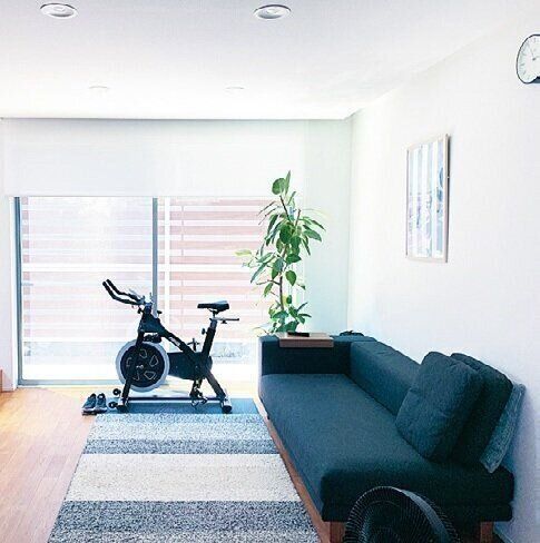 夫がトレーニンググッズを購入し、リビングがジム化。テーブルがないおかげで、それでもスペースに余裕あり!コロナ自粛中の5キロ増を解消すべく、私も運動に励みます。