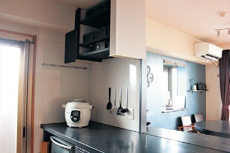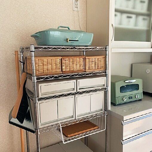 学校が休みの日は、ホットプレートに頼り切り。オープン収納なら、すぐ取り出せて、片づけも簡単です。焼きそば、もんじゃ焼き、たこ焼きなど、子どもが好きなメニューをローテ!