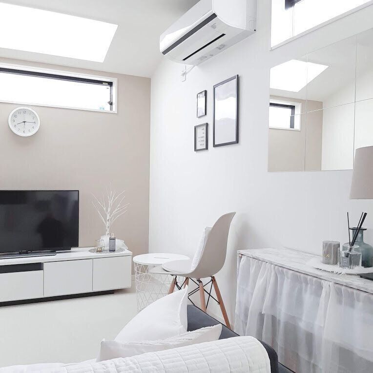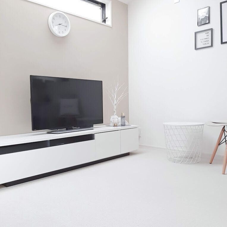 新しいテレビ台は高さを低くして色もホワイトに。もともとソファはローソファでしたので相性も抜群です。