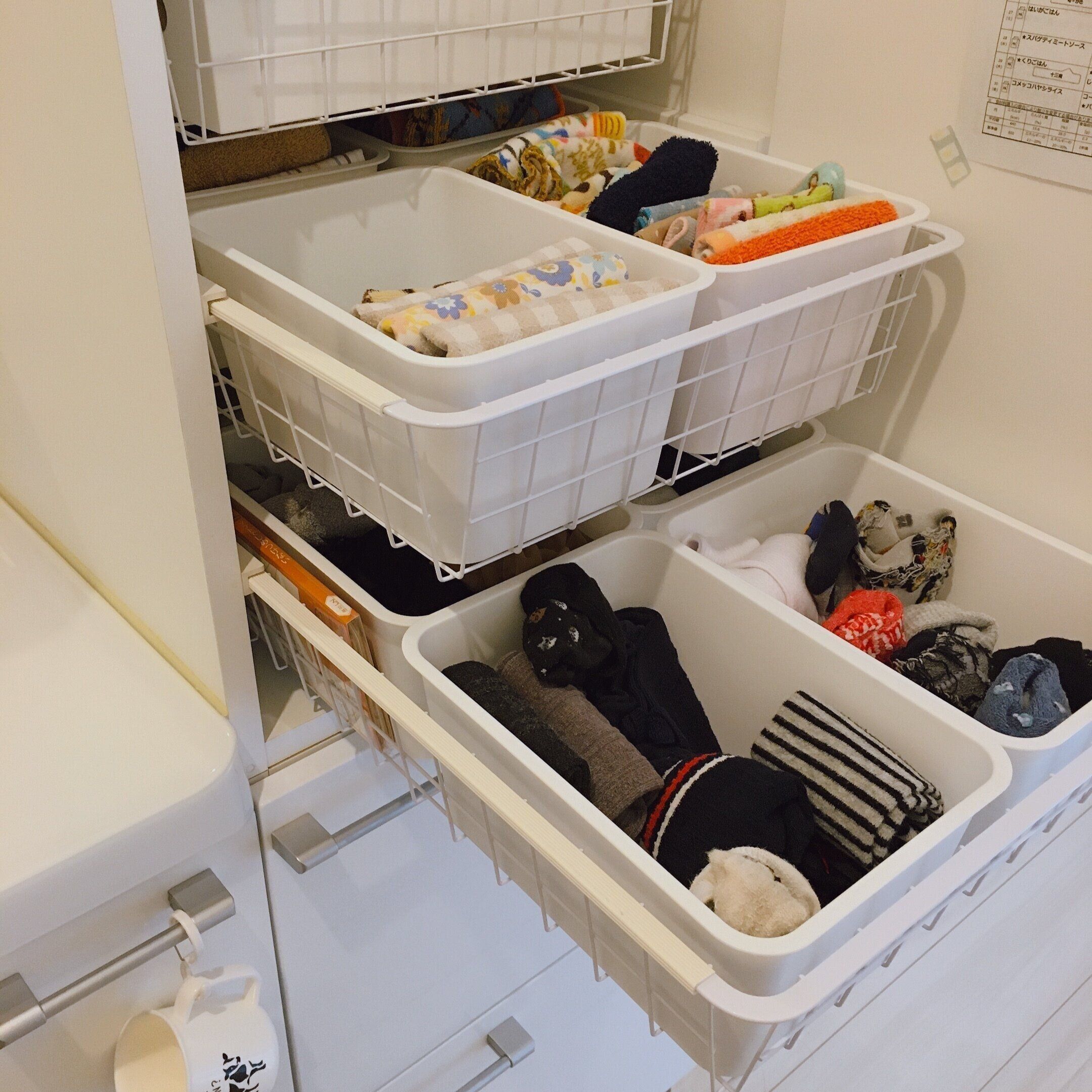 家族4人分をここに収納している為、乾燥から戻す時も靴下だけを持って人ごとにポイポイ入れるだけ。