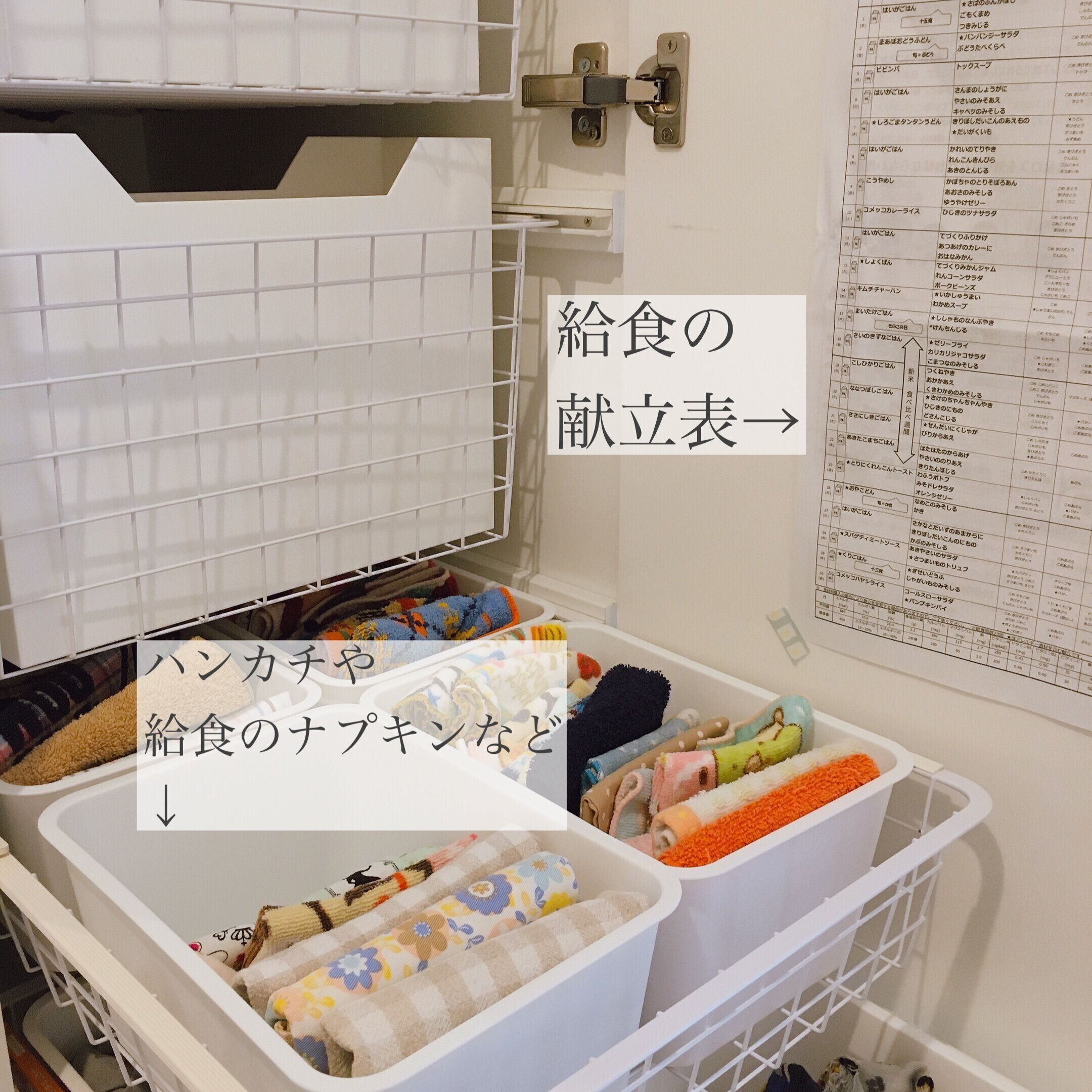 靴下の上の段に給食のナプキンと、ハンカチを収納しています。