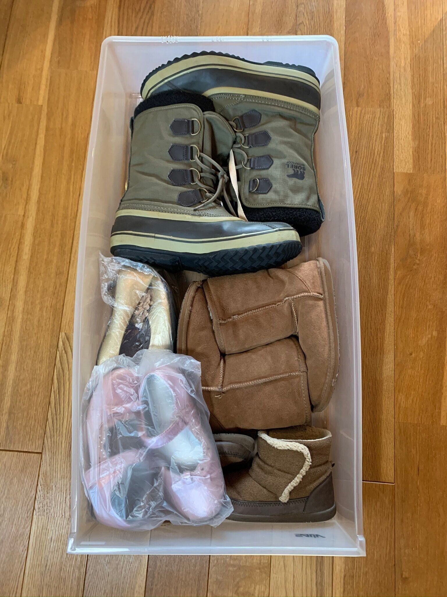 シーズンオフの靴(スノーシューズなど)や行事用の靴は3軍の靴として、画像の様にウォークインクローゼットの衣装ケースに専用ケースを設けて収納しています。