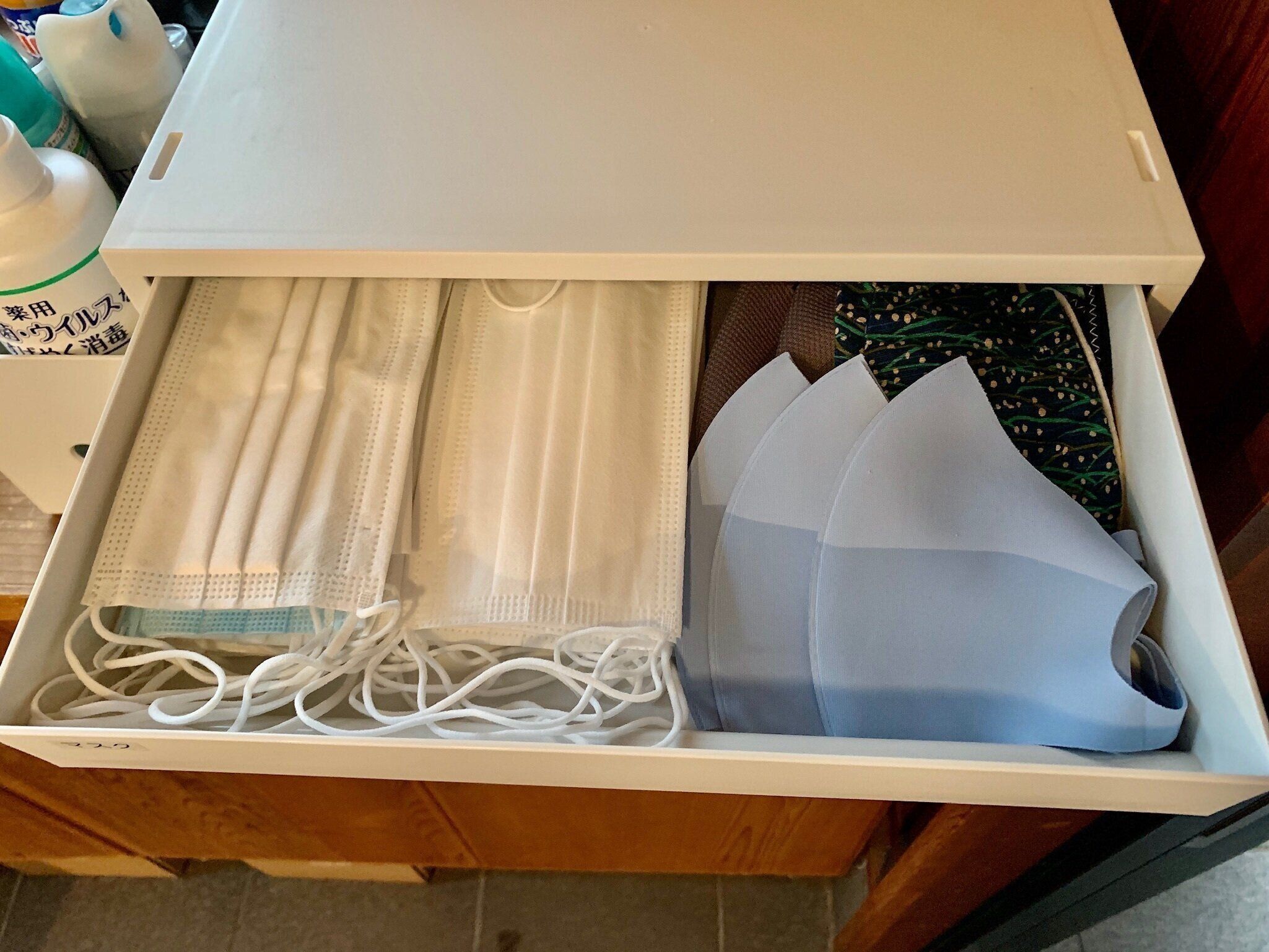 衛生面も気になると思うので、埃がつかないように、マスクは引出しに収納しています。わが家では無印良品のポリプロピレンケース引出式・横ワイド・薄型・ホワイトグレーを使用しています。