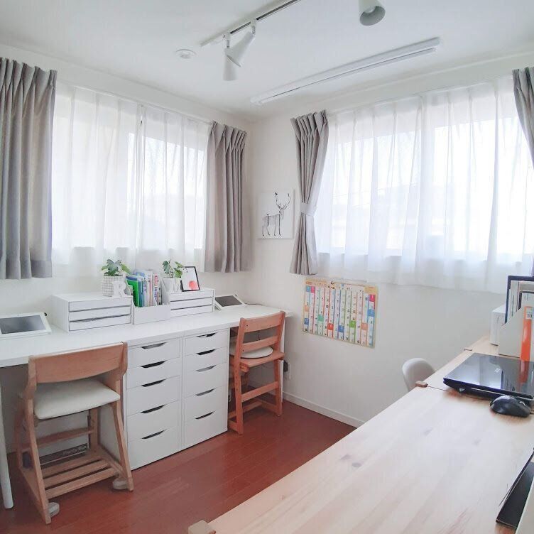 ダイニングテーブルがなくった分、スペースが大きく空いたので学習スペースを大き目に取りました。狭小住宅のダイニングコーナーに100cm×60cmのデスクを何と2つも並べています。大容量の収納を土台にする事で収納スペースを確保し主に学用品を収納しています。(椅子以外は全てイケアの商品です)