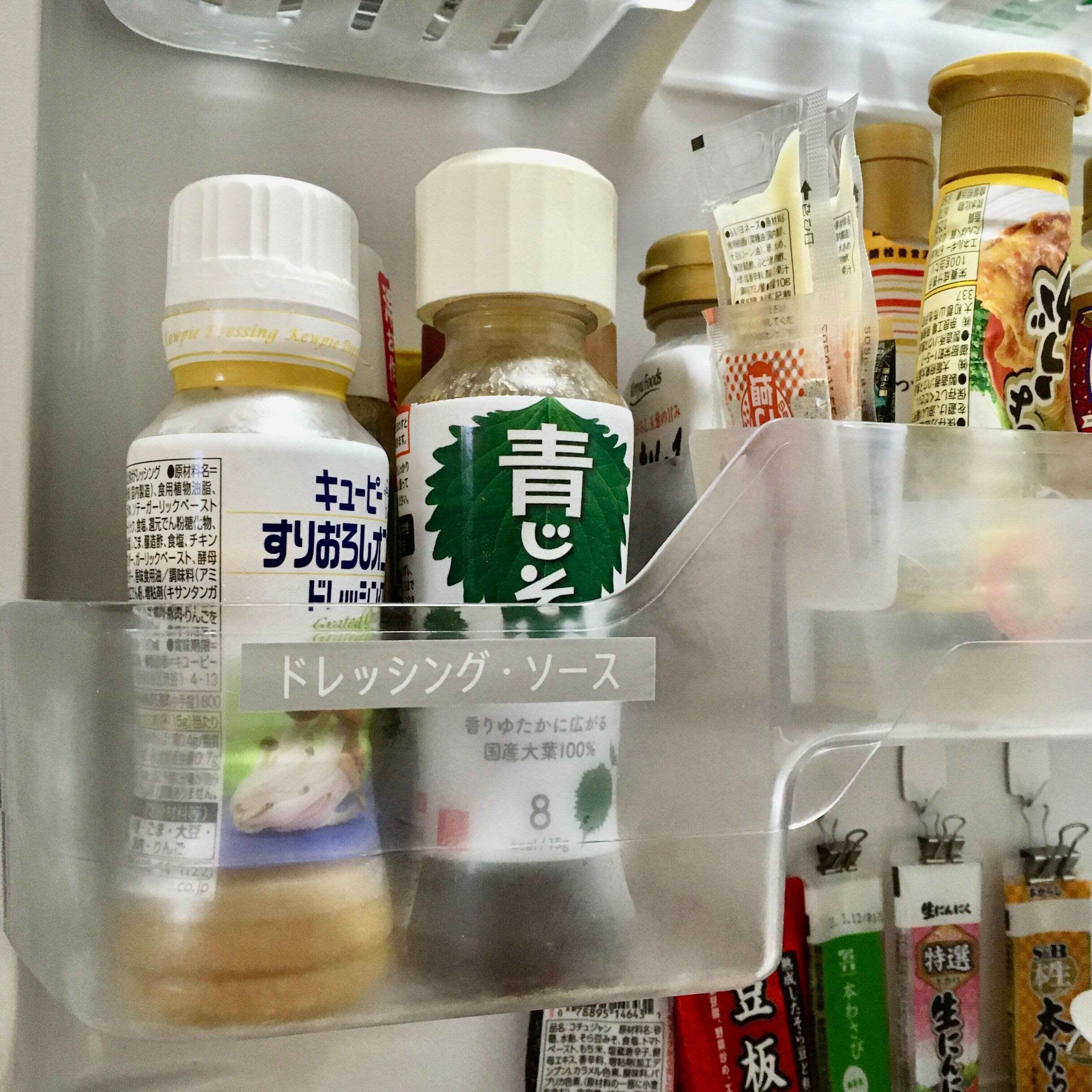 例えばわが家の冷蔵庫。ポケットには「ドレッシング・ソース」とラベリングしています。これは、絶対にソースとドレッシング以外はここに入れないという決意です。