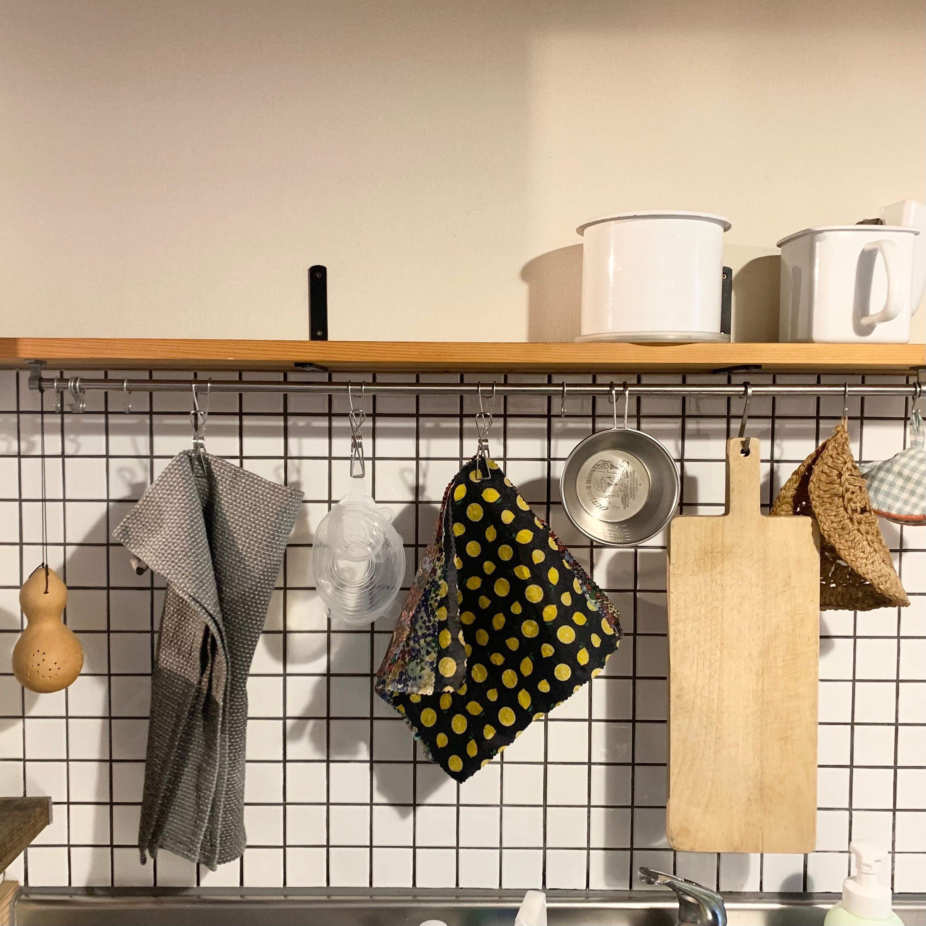 我が家は流し台の上にポールがあるので、そこにキッチンのあらゆるモノたちを吊るしています。