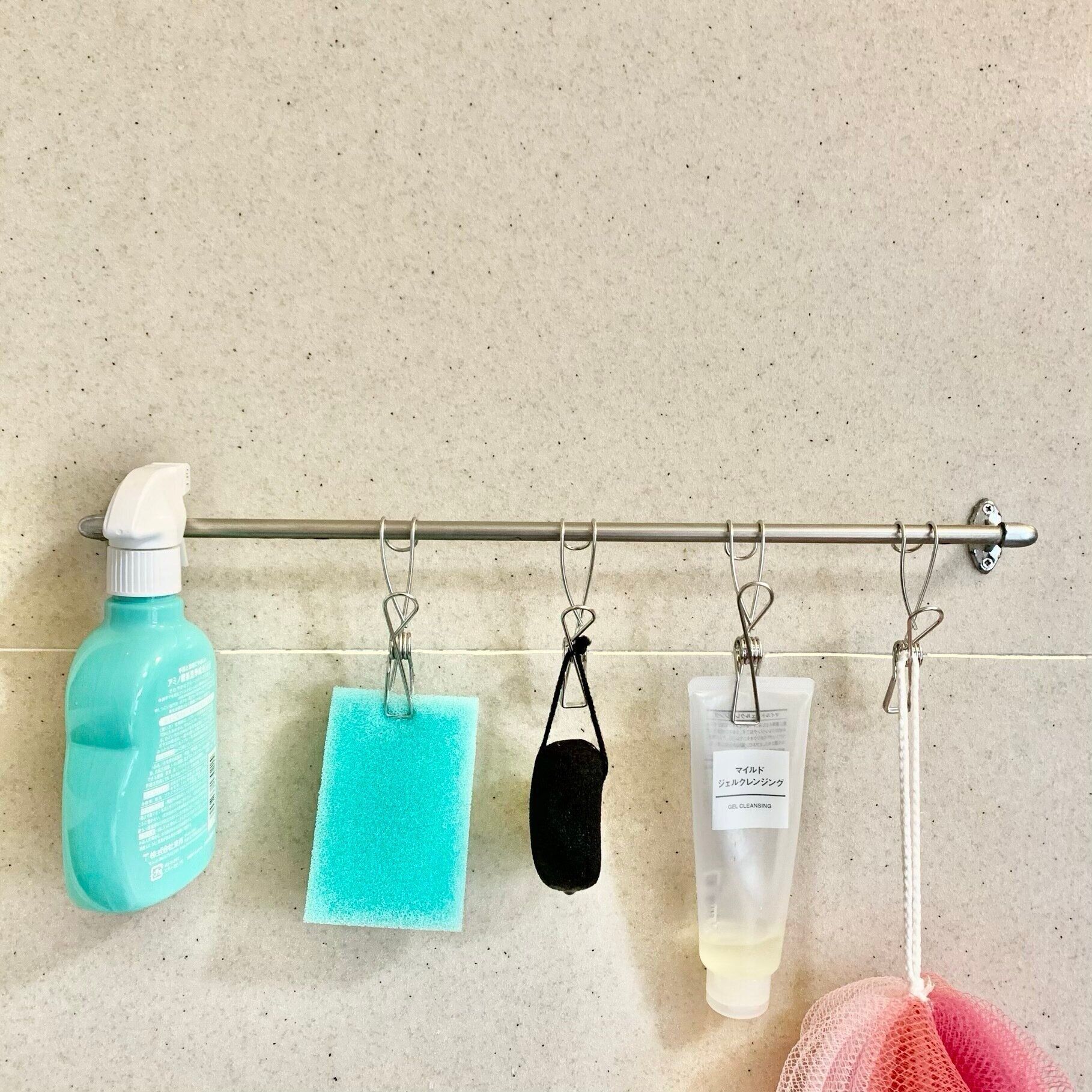 お風呂で使用する物たちも直置きにすると、滑りなどが気になるので、吊るす収納を取り入れています。