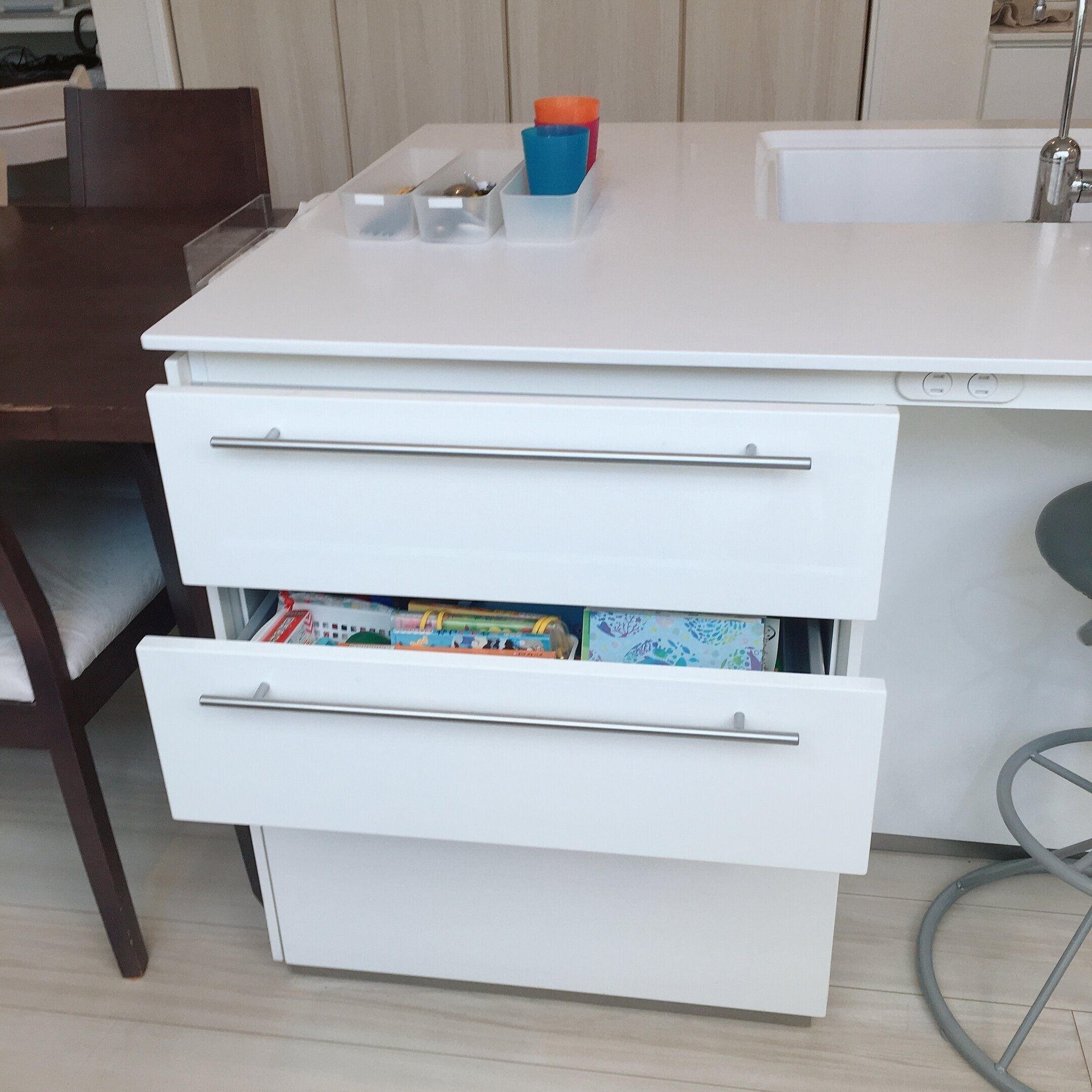 置きっぱなし防止策として、キッチンにある引き出しを家族1人1ヵ所ずつ自由に使ってもらっています。子どもたちはそれぞれ文房具や折り紙、カードゲームなどを収納しています。