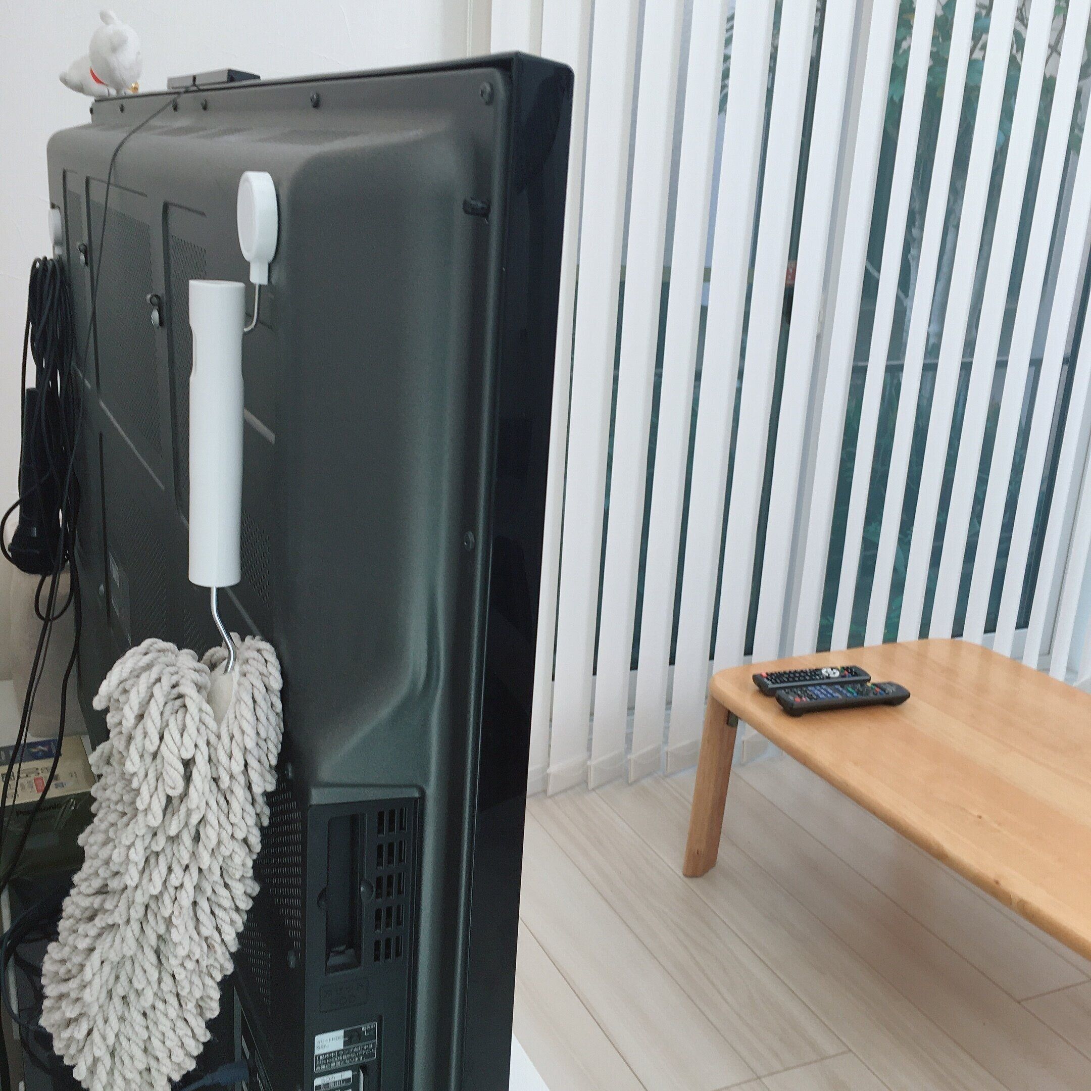 掃除がしやすい環境にするために、ハンディモップをテレビの裏に収納しています。テレビまわりはホコリが溜まりやすいところなので、ハンディモップをすぐそばに置いたことで気づいたときにササッと掃除をできるようになりました。