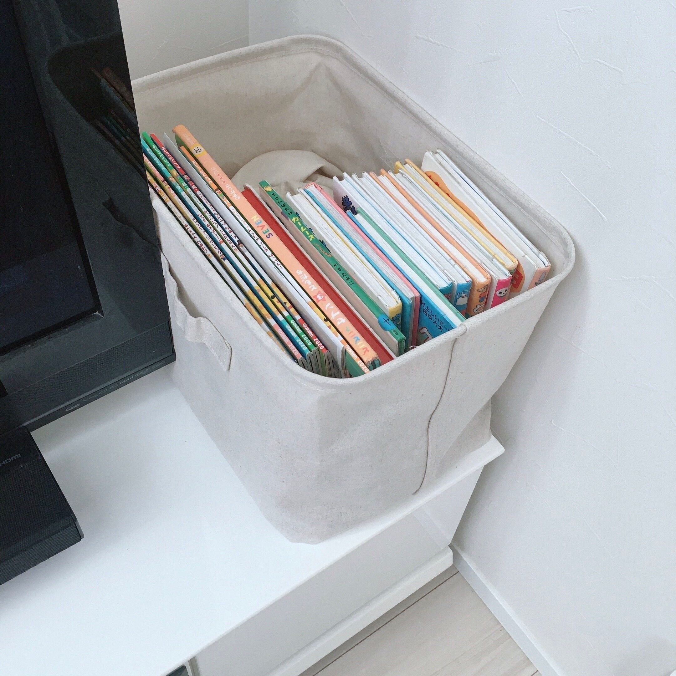 本はリビングで読むことが多いので、各部屋に置くよりも便利です。図書館に持っていくときの本を入れるエコバッグもいっしょに収納しています。