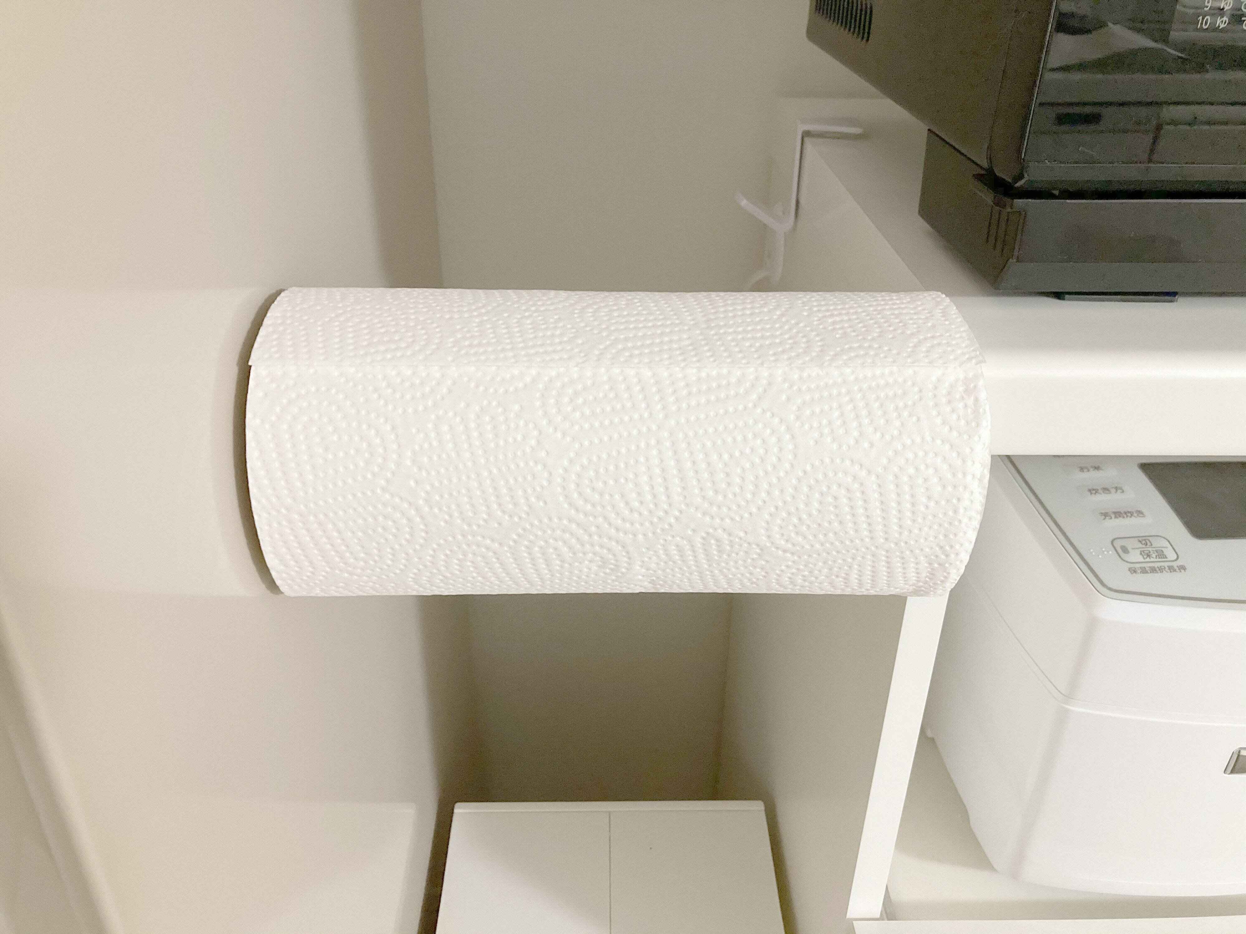 冷蔵庫と食器棚の間につっぱり棒を使用し、キッチンペーパーを取りつけています。当初はホルダーを買う予定でしたが、新たに買わずとも家にあったつっぱり棒で隙間にギリギリ設置できました。