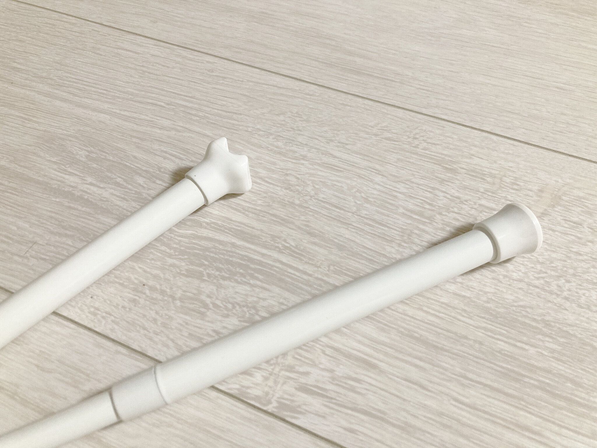 平らな場所で使用できる一般的なつっぱり棒と、同じ種類で「ジョイントラック用カーテンポール」という名前の、ポールにつっぱれるつっぱり棒を使用しています。どちらもダイソーの商品です。