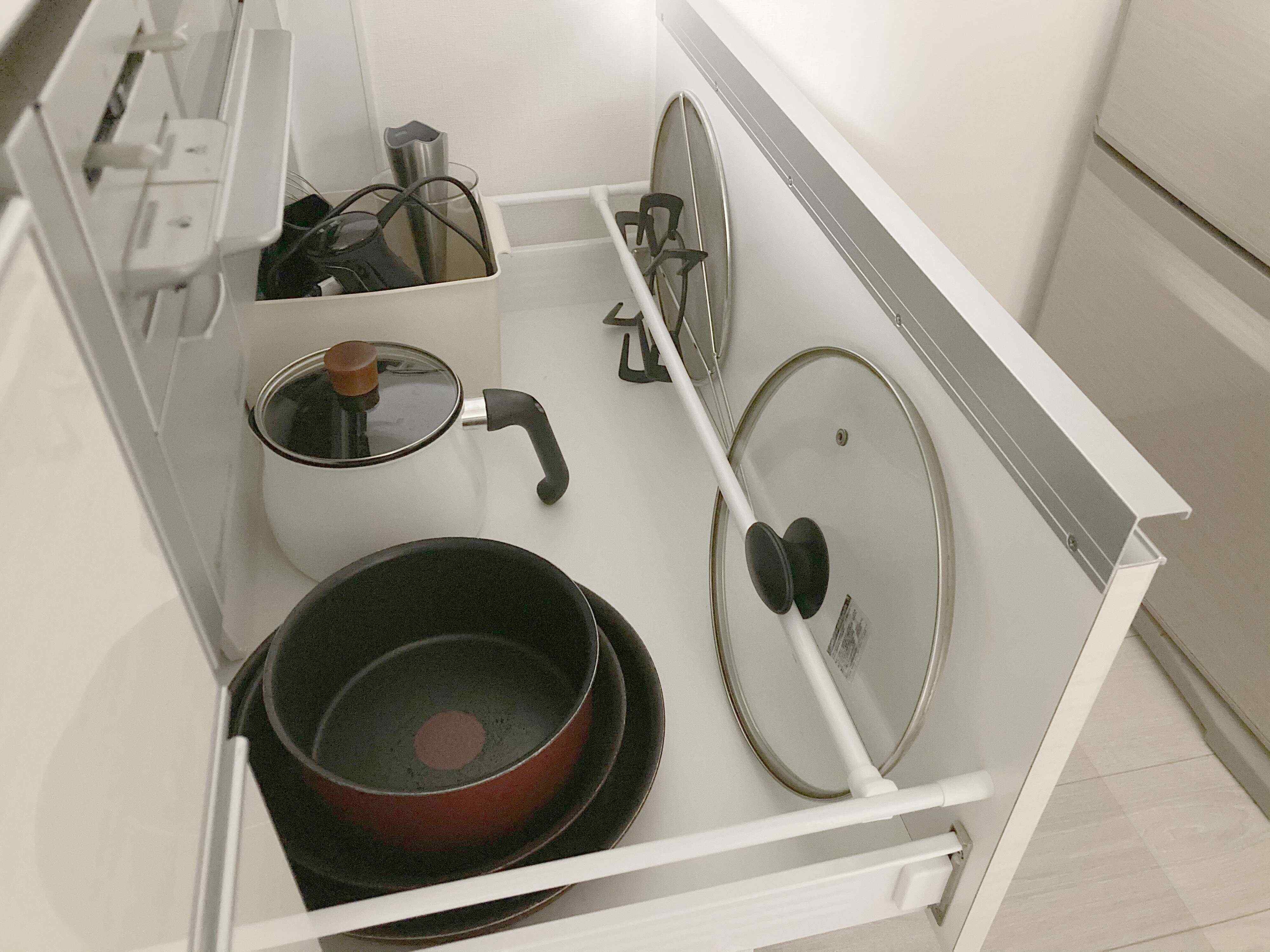 フライパン収納の引き出しにジョイントラック用カーテンポールをつけて、ふだん使っていない五徳やフライパンのフタなどを立てかけています。