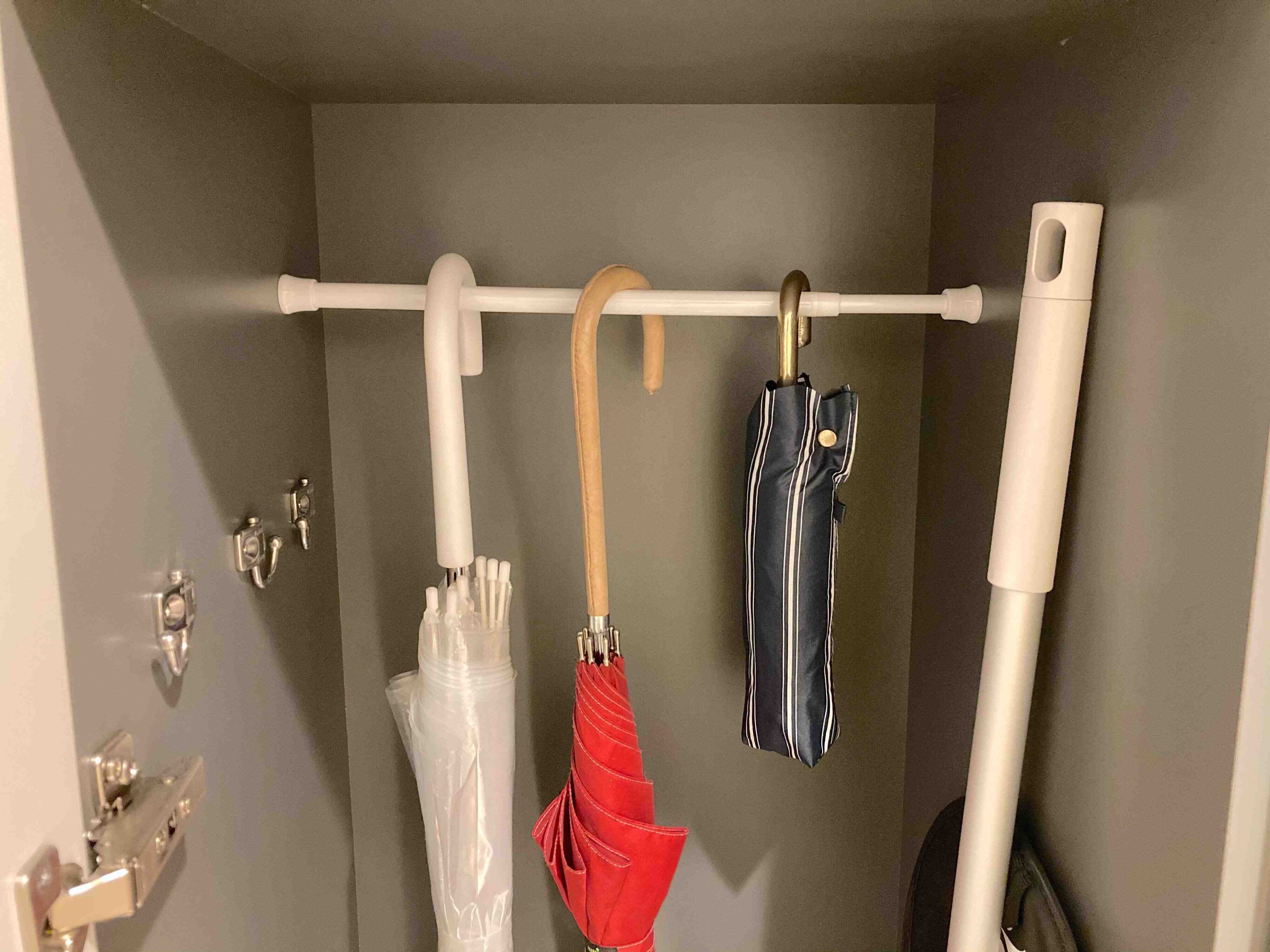 玄関収納の中につっぱり棒を使用し、傘をかける収納にしています。ぬれた場合は乾くまで外にかけておき、乾いたらここに収納します。