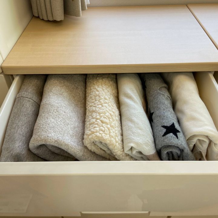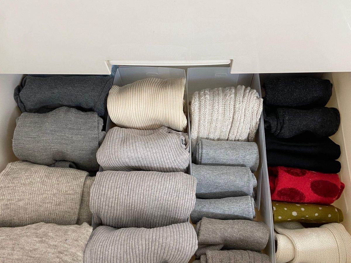 冬物は収納ケースを使わずに立てて収納しています。洋服などは畳み方次第で立ちやすくなるので、ケースがなくてもスッキリ収納が可能です。