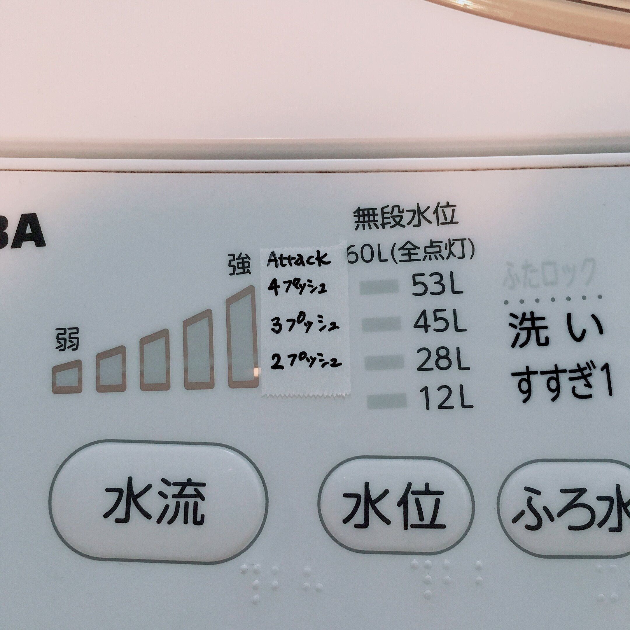 パッケージをはがしても何プッシュ入れるとよいかわかるように、わが家はマスキングテープに書いて、それを洗濯機に貼っています。そうすることで、すぐに適量がわかり、時短に繋がります。そして、誰にでもわかりやすくしておくことで、家族も手伝いやすくなり、家事シェアができてママもラクになっていきます。