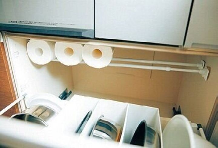 スライド収納の上のデッドスペースに突っぱり棒2本で棚をつくり、ペーパータオル置き場に