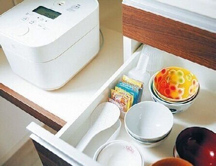炊飯器の横の引き出しに茶わんを収納すれば、ごはんをよそう作業がスムーズ。「しゃもじやふりかけなど、一緒に使う物もここにしまえば、一度に取り出せるし、夫や娘も一目瞭然」。