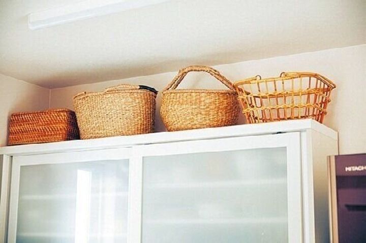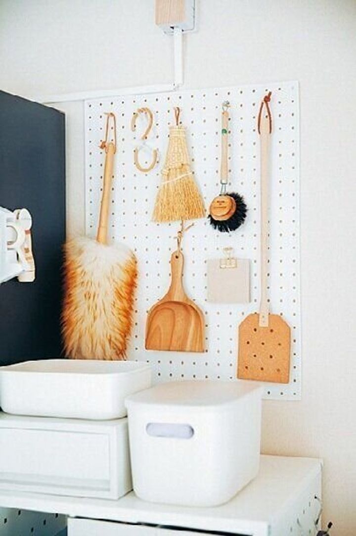 はたきやほうきなどのお気に入りの道具や、大好きなカゴは、キッチンに飾りながら収納。「目に入るたびにキュンと幸せな気持ちに。忙しくても機嫌よく過ごせる秘訣です」。