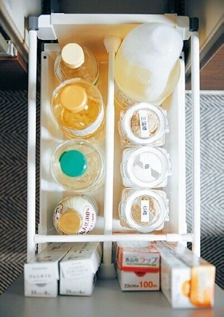 突っぱり棒で空間を十字に仕切り、調味料を収納