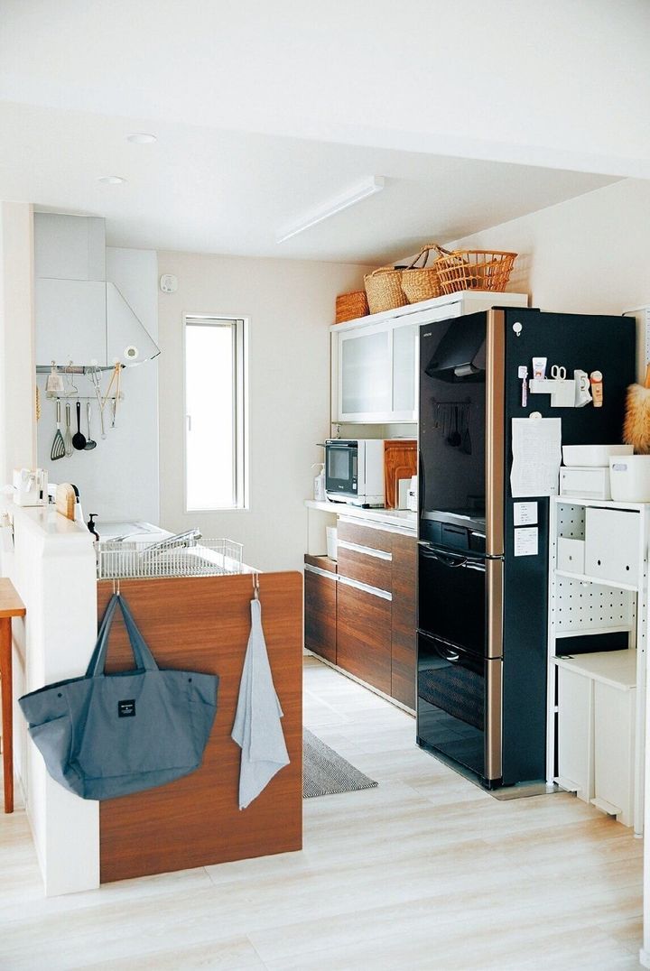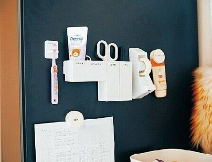 はさみやハンドクリーム、作り置きのラベル書き用のマステやペンは、すぐ手に取れる冷蔵庫横がベスト。キッチンで歯をみがく子どもの歯磨きセットは洗面所に置かず、ここが指定席。