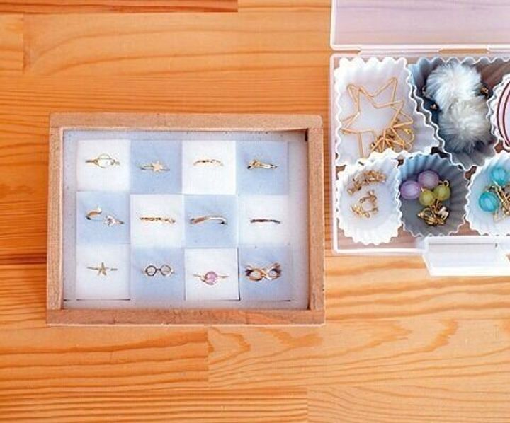 指輪の収納にはメラミンスポンジ、その他のアクセサリーはお弁当用のシリコンカップを活用。「家にあるもので片づけられ、傷がつきにくいんです。スポンジは再利用できるのも魅力」。