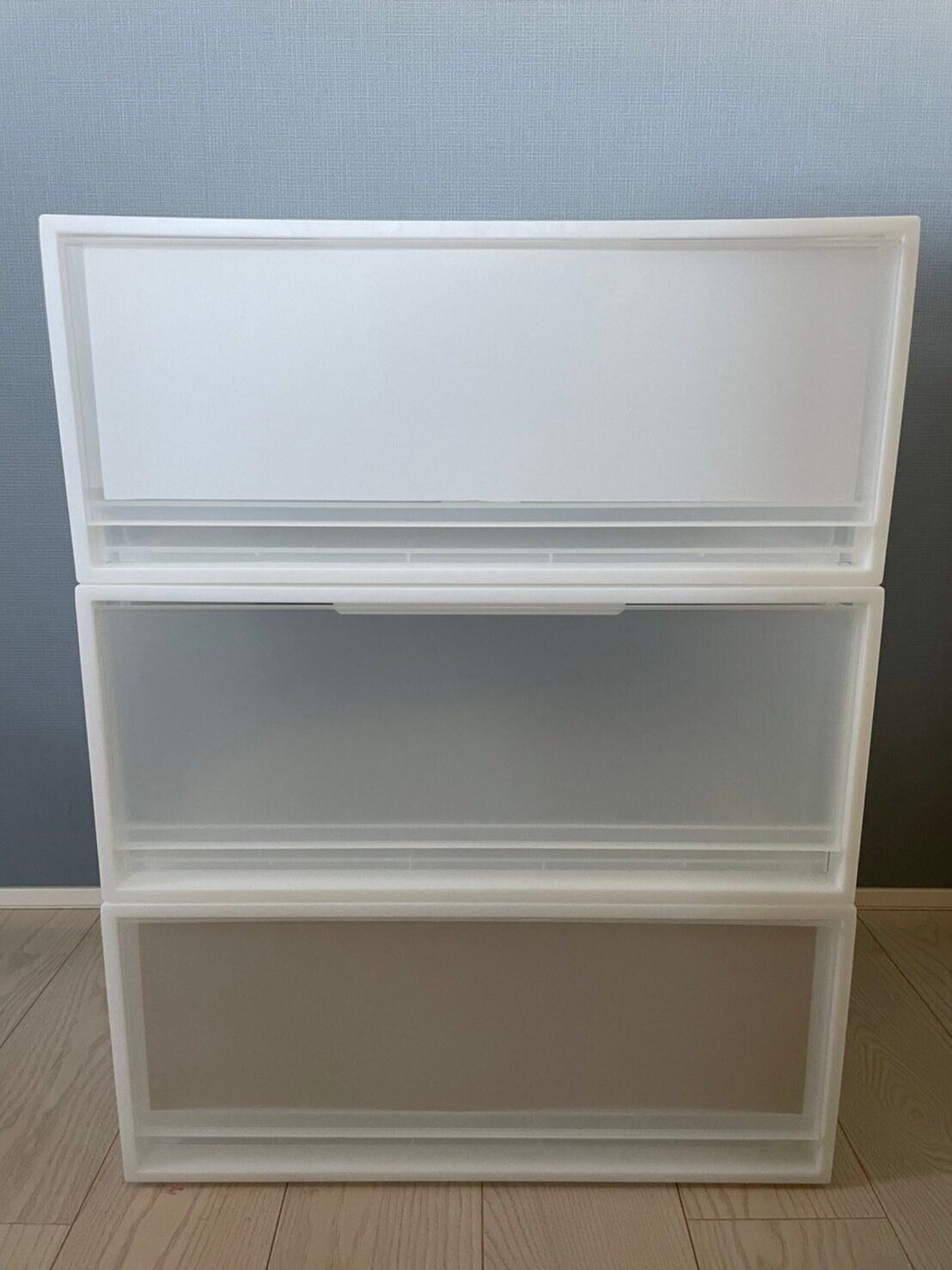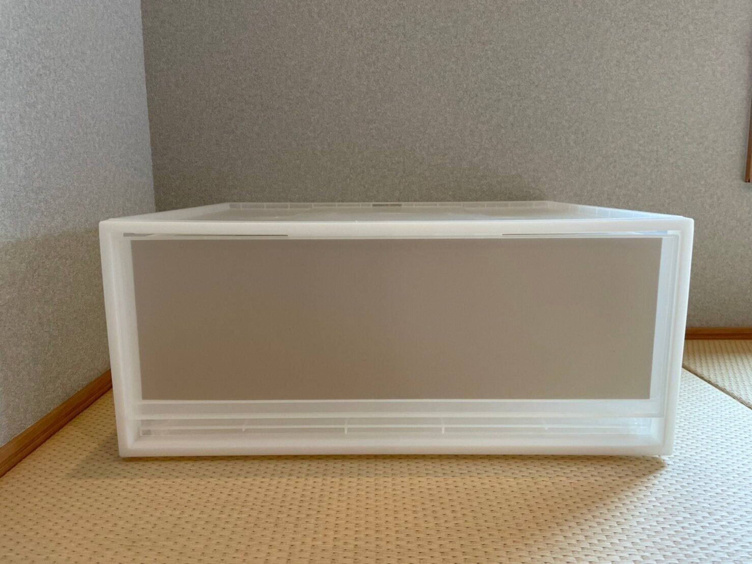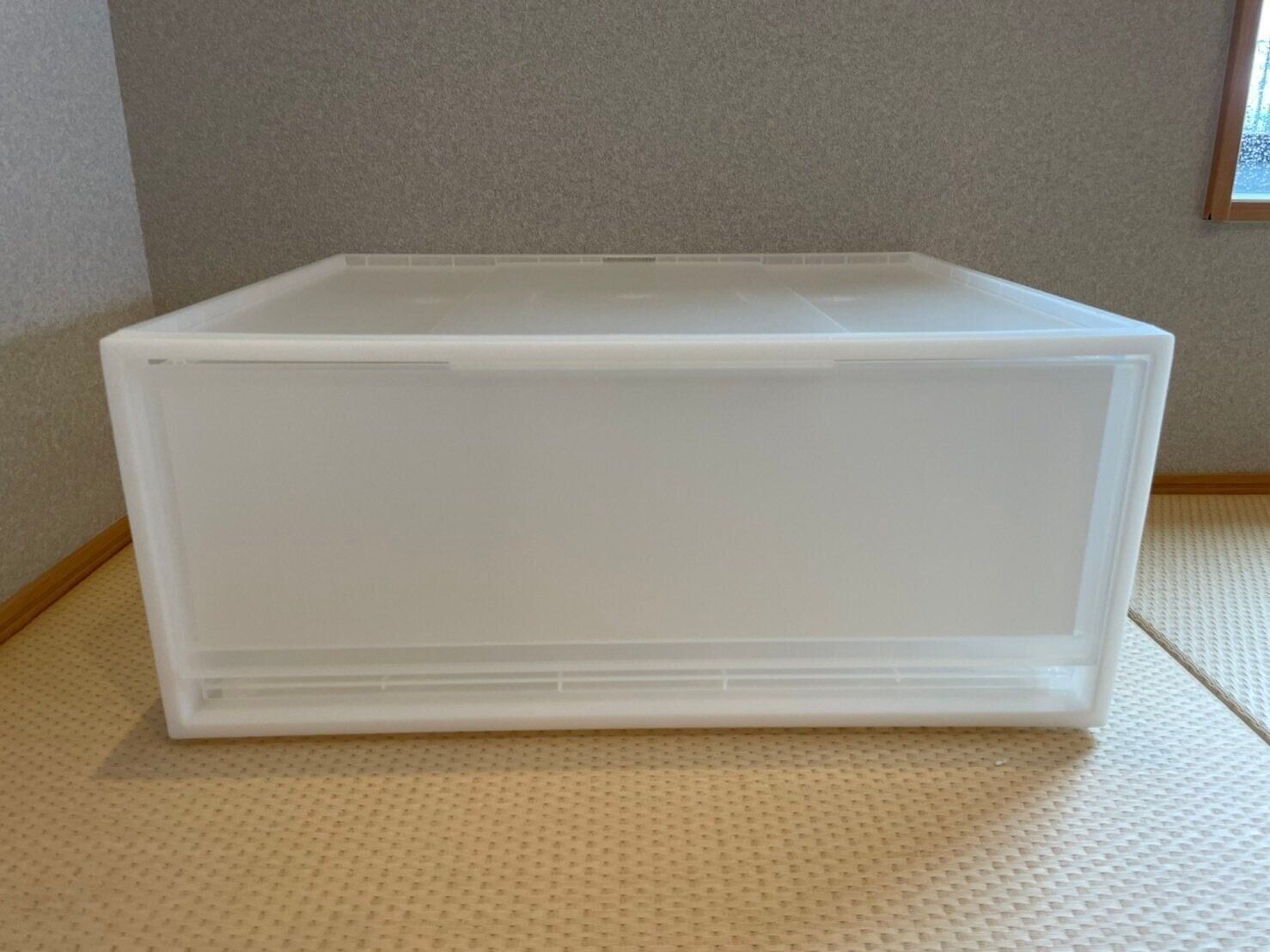 写真は何も加工していない状態の衣装ケース。何が入っているか正面から見て分かりやすいというのはメリットですが、洋服をきれいに畳んで収納しなければ雑然とした印象になってしまうというデメリットもあります。