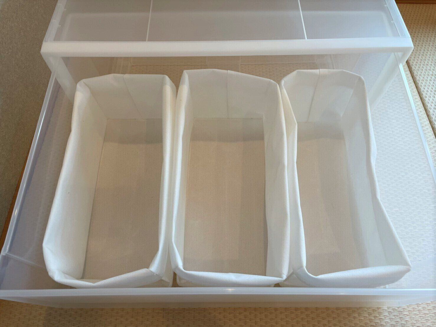 収納ケースの外側をスッキリさせたら、内側もスッキリさせたいところ。衣類などは同じく無印良品で販売されている「不織布仕切ケース」で小分けするのがおすすめです。